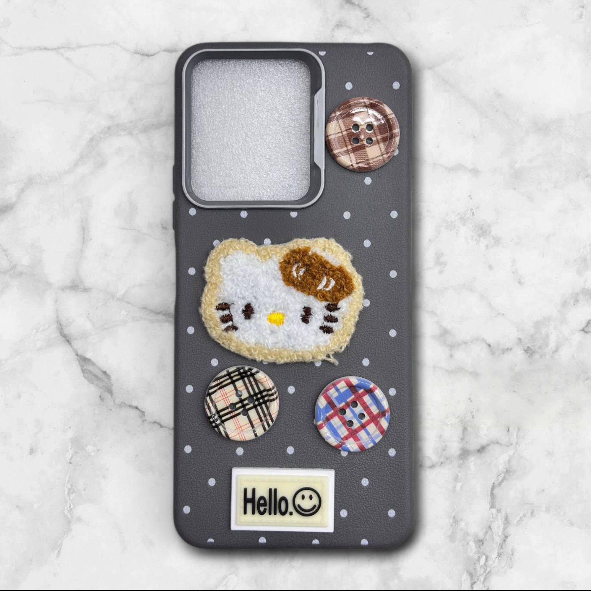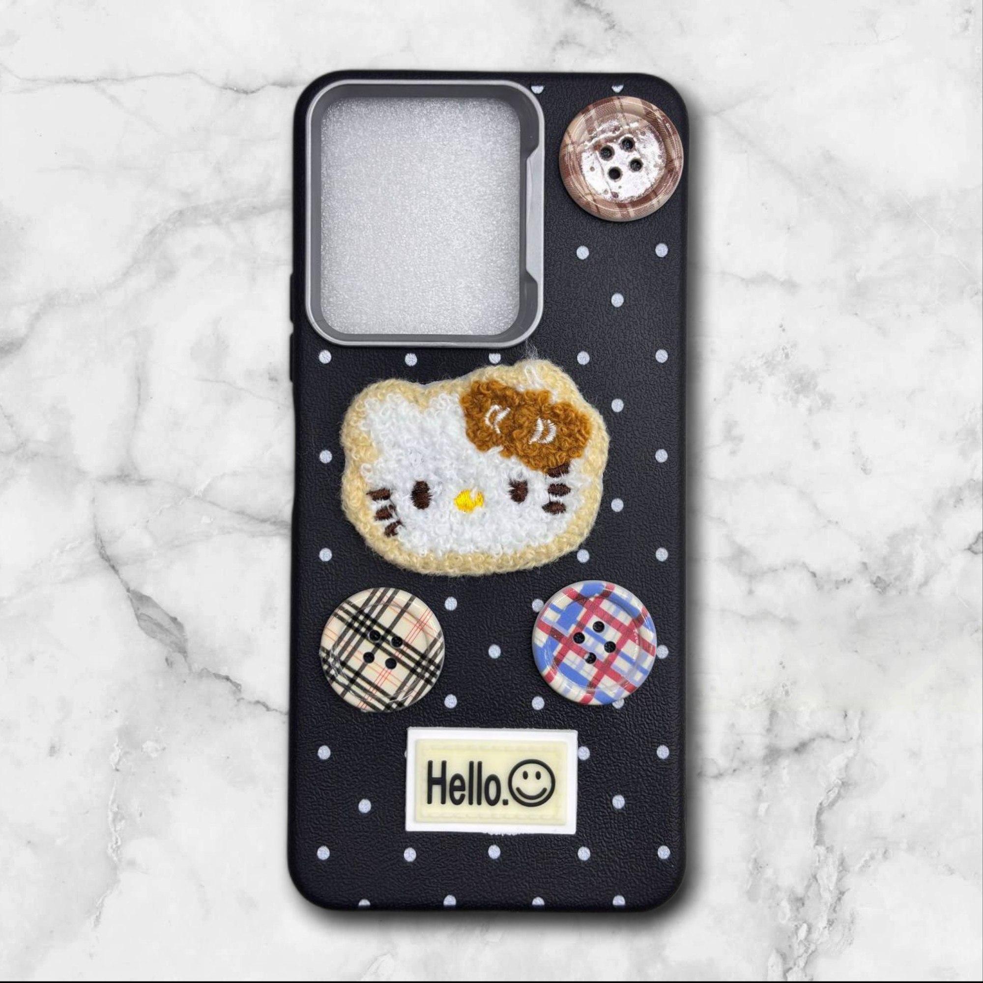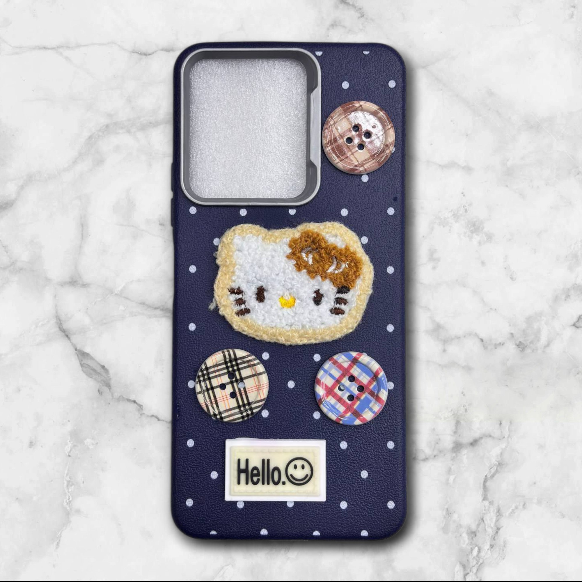 طرح برجستهی هلو کیتی، دکمههای رنگی و زمینهی خالخال، این قاب رو تبدیل کرده به یه انتخاب شیرین برای استفاده روزمره یا کادو دادن.