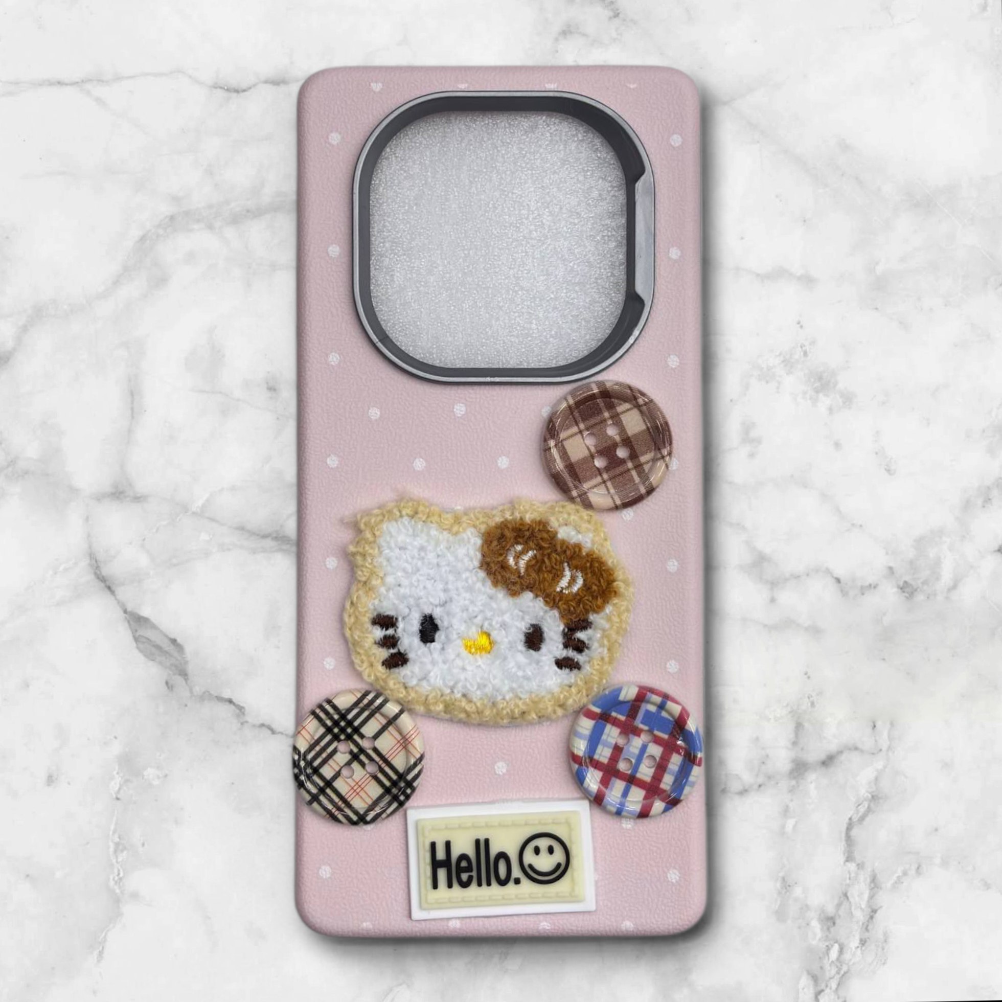 روی بدنه‌ی قاب، طرح پارچه‌ای برجسته از صورت هلو کیتی دوخته شده که جنس نرم و ملموسی داره و از نزدیک کاملا شبیه یک عروسک کوچیک به‌نظر می‌رسه. در پایین قاب هم چند دکمه‌ی فانتزی با طرح پارچه‌ای کار شده که حس دست‌ساز و هنری به قاب می‌دهد
